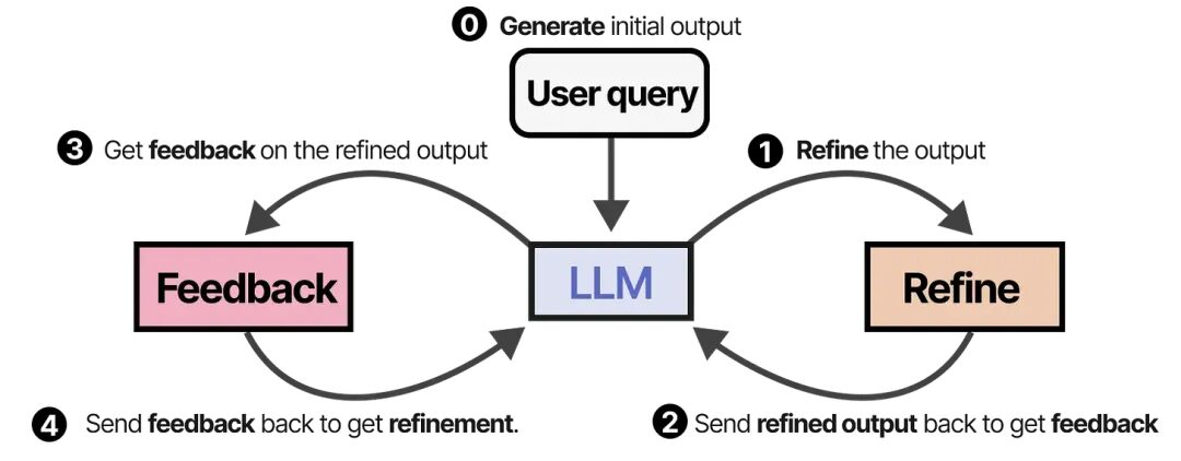 还有一种类似且巧妙的方法叫做 SELF-REFINE。在 SELF-REFINE 中,同一个 LLM 会反复进行输出改进和自我反馈:它先生成初始答案,再对自己的答案进行评价反馈,随后依据反馈改进答案,如此循环。