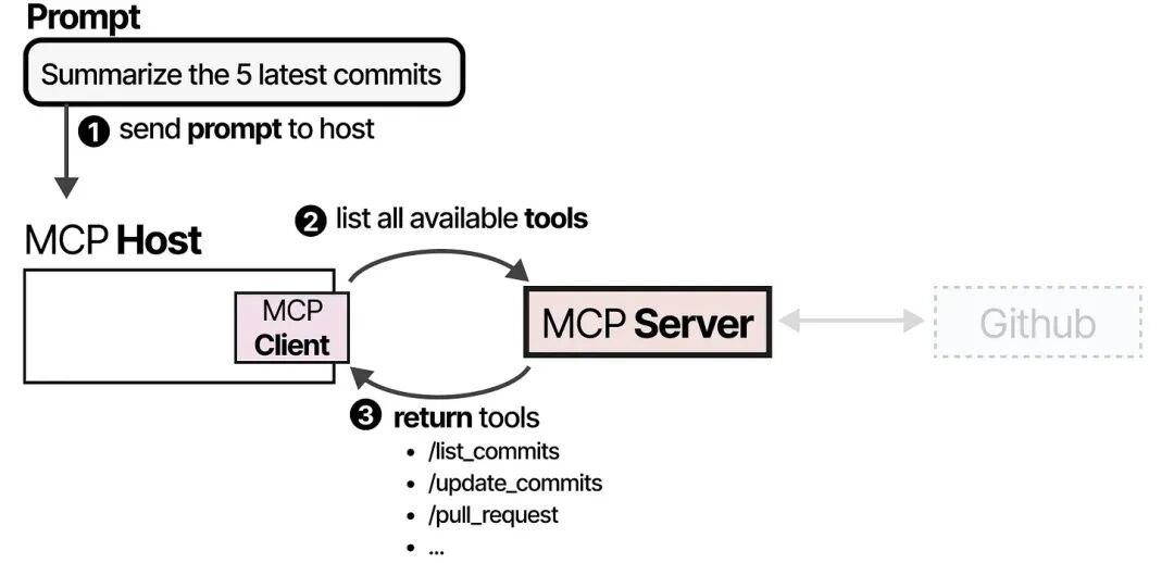 举个例子,假设你希望某个支持 MCP 的 LLM 应用帮你总结一下 Github 代码库中最新的 5 次提交记录。首先,MCP 主机(加上客户端)会询问 MCP 服务器,看看有哪些可用的工具(比如访问 GitHub 仓库的接口)。