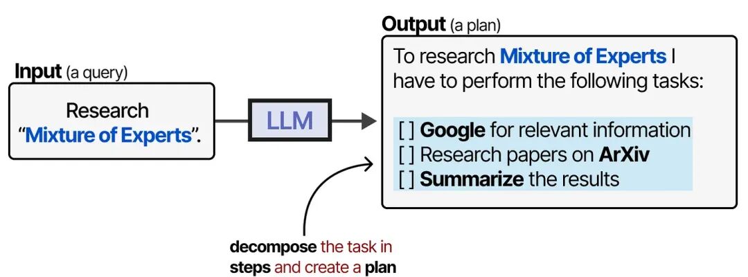 通过调用工具,LLM 确实能够显著扩展自身的能力范围。然而,拥有工具只是第一步,更关键的问题是:在一个智能体系统中,LLM 如何智能地决定何时该用哪个工具,又该按照什么顺序采取哪些步骤呢?这就需要引入一个至关重要的能力——规划能力。简单来说,规划就是让 LLM 能够将复杂的任务拆解成一系列逻辑清晰、可执行的步骤。