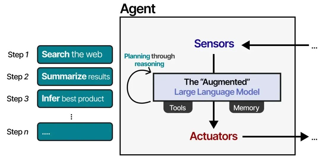具体而言,LLM Agent 通过文本形式获取环境信息,完成感知过程,并通过使用工具(例如执行网页搜索)对环境进行操作。