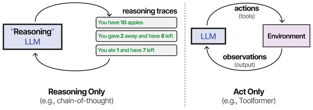 赋予 LLM 推理能力很重要,但仅有推理还不足以让它规划出实际可执行的行动步骤。我们前面介绍的技术,要么是专注于推理过程,要么是专注于通过工具与环境交互。
