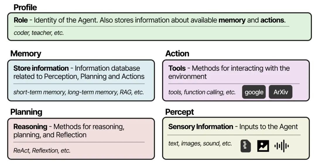 无论采用哪种方法构建多智能体系统,一般都需要考虑几个基本组成部分:智能体的人设(Profile)、环境感知(Percept)、记忆(Memory)、规划(Planning),以及可用的行动集合(Action)等。