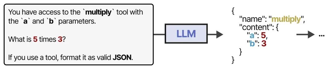 当然,JSON 并不是唯一的选择。除此之外,我们也可以让 LLM 直接生成调用工具的代码,或者为模型预先定义好一些函数供其调用,比如一个简单的乘法计算函数。这种让模型直接调用预定义函数的做法通常被称为函数调用(Function Calling)功能。
