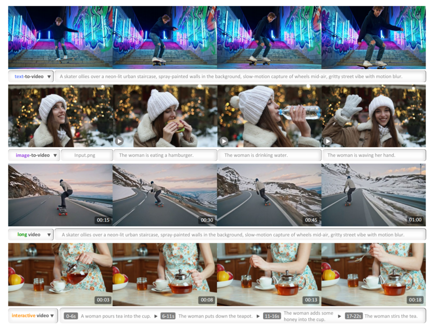模型可以基于多帧条件,原生续接视频内容,实现跨帧时序一致与物理运动合理的长视频生成。