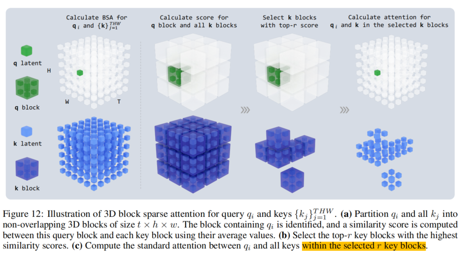 - 块稀疏注意力(BSA):只计算 top-r 关键块注意力,计算量降到 10% 以下。