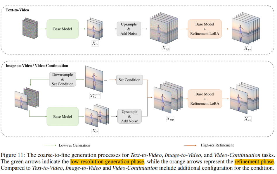 - 粗到精生成(C2F):先生成 480p 低帧率视频,再用 LoRA 模块超分到 720p 30 fps。
