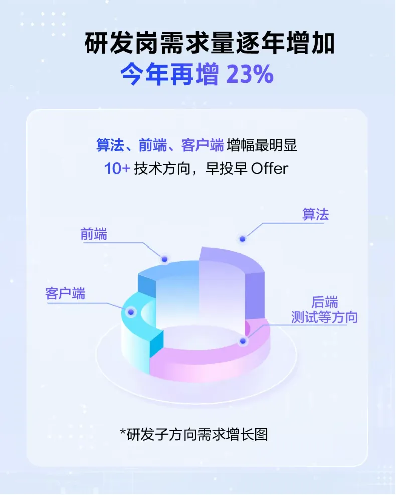 美团开放6000个席位,技术类岗位呈现扩招趋势。其“北斗计划”面向全球顶尖硕博,聚焦大模型基座、大模型应用、自动驾驶、无人机、智能决策等领域。另外,还首次开放“AI产品经理提前批”,面向全球招募高潜AI产品人才。