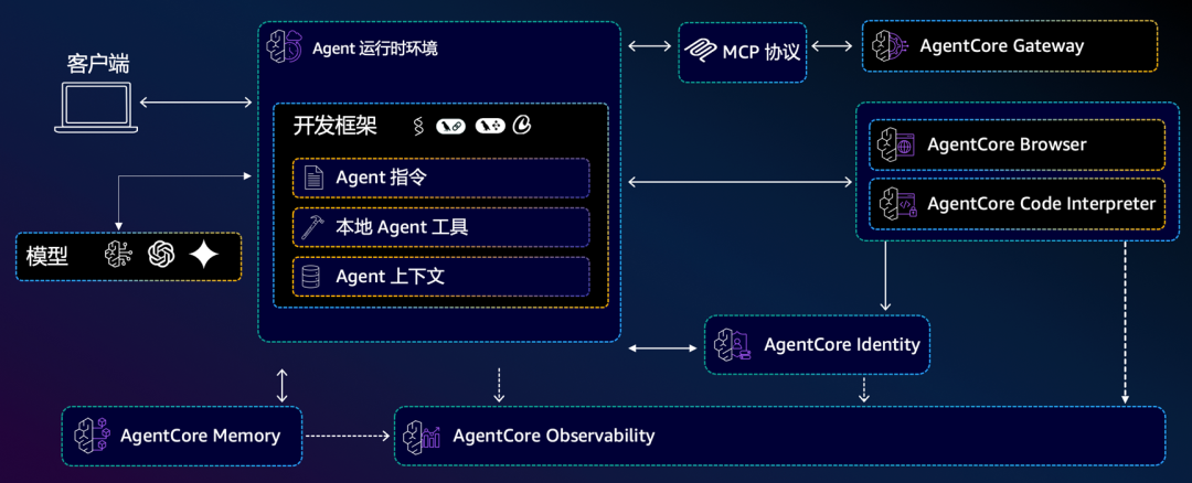 提供了低延迟的Serverless环境,用于部署Agent或MCP工具。该环境具备会话隔离功能,支持各类Agent框架,包括流行的开源框架(如Strands Agents、LangGraph、CrewAI等)。此外,它能够集成各种工具和模型,并有效处理多模态工作负载及长时间运行的Agent应用。
