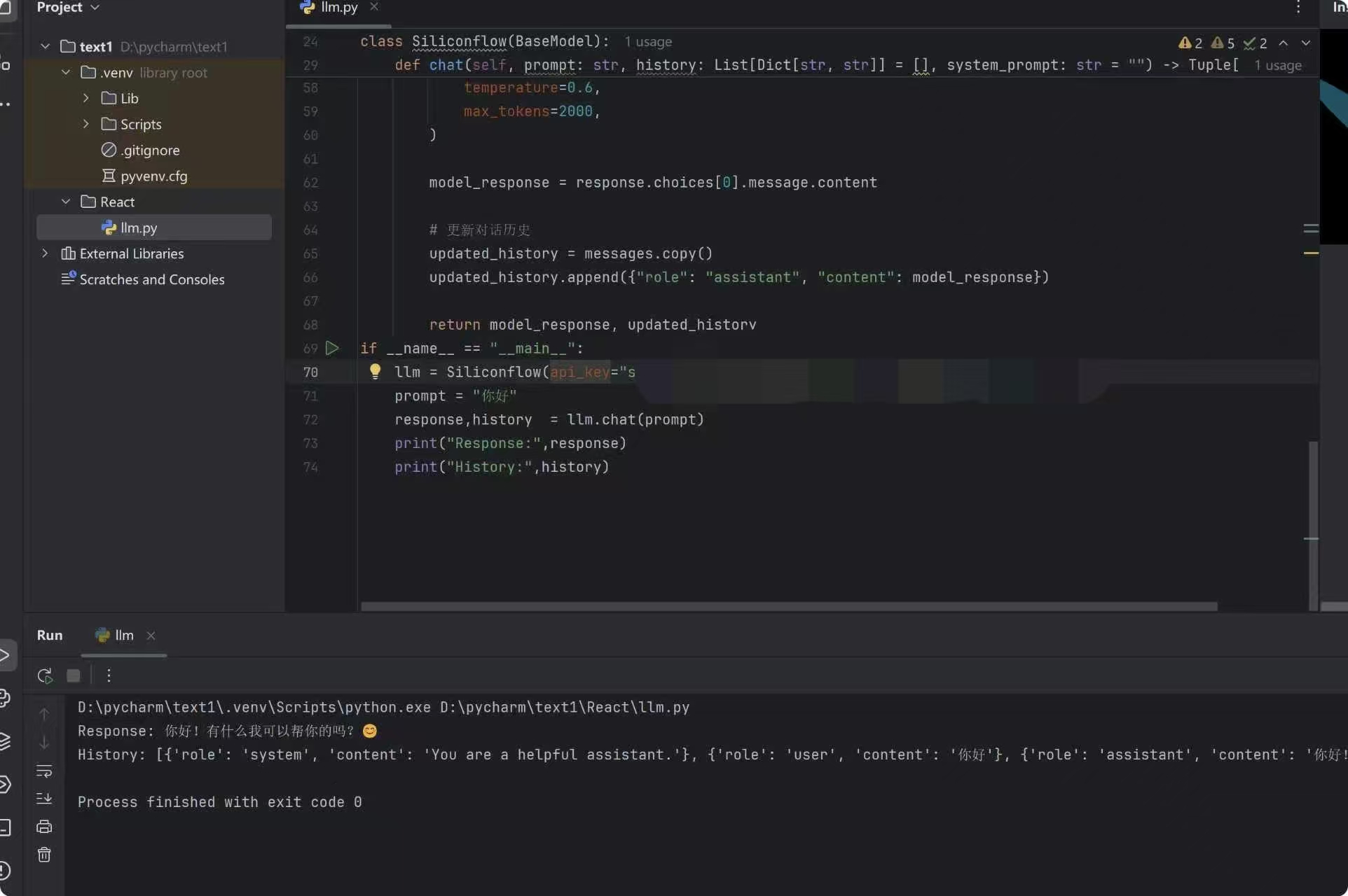 经过一番折腾,我终于成功运行了ReAct风格的代码(以SiliconFlow API为例,模拟“观察-思考-行动”循环):