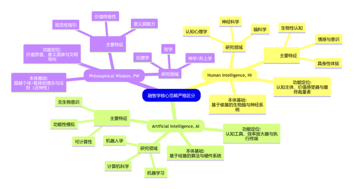 根本区分是前提:人类智力HI(碳基生物认知)、人工智能AI(硅基人工系统)、哲学智慧PW(近神性理念)三者在本体论上严格区分,不可混淆。