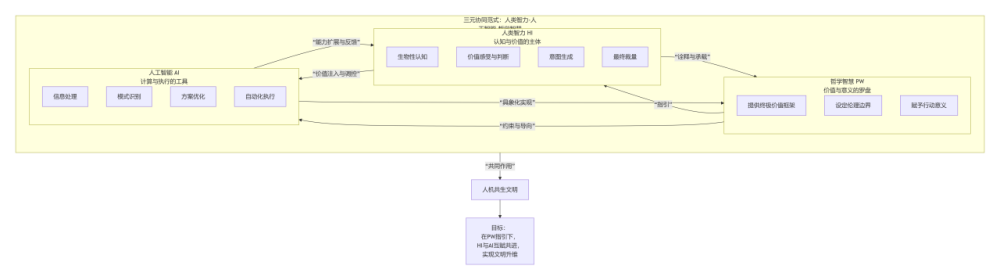 核心修正与重述:融智学三元协同范式融智学所展望的人机互助新时代,其核心是建立 “人类智力-人工智能-哲学智慧” 的三元协同关系,而非简单的“HI-AI”二元互动。