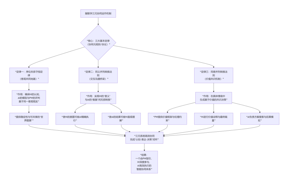 为使HI、AI、PW能够有效协同,必须有一套形式化的“交互协议”。融智学三大基本定律正是为此创造并设计,它们构成了三元系统内部运作的元规则。
