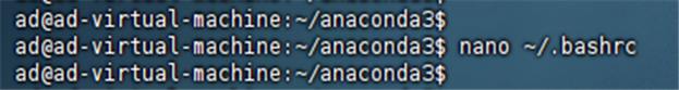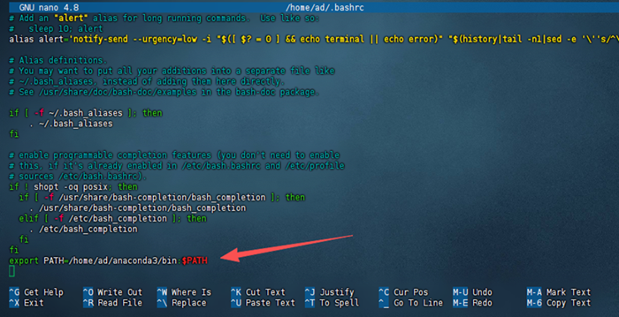 在bashrc文件的最后一行加入:export PATH=/home/ad/anaconda3/bin:$PATH (ad是自己的用户名)。按Ctrl+x 保存并退出编辑