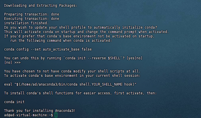一路回车和yes,注意: 终端出现Anaconda3 will now be installed into this location:可输入自定义路径进而支持自定义conda安装路径(直接回车会默认安装到HOME目录)。