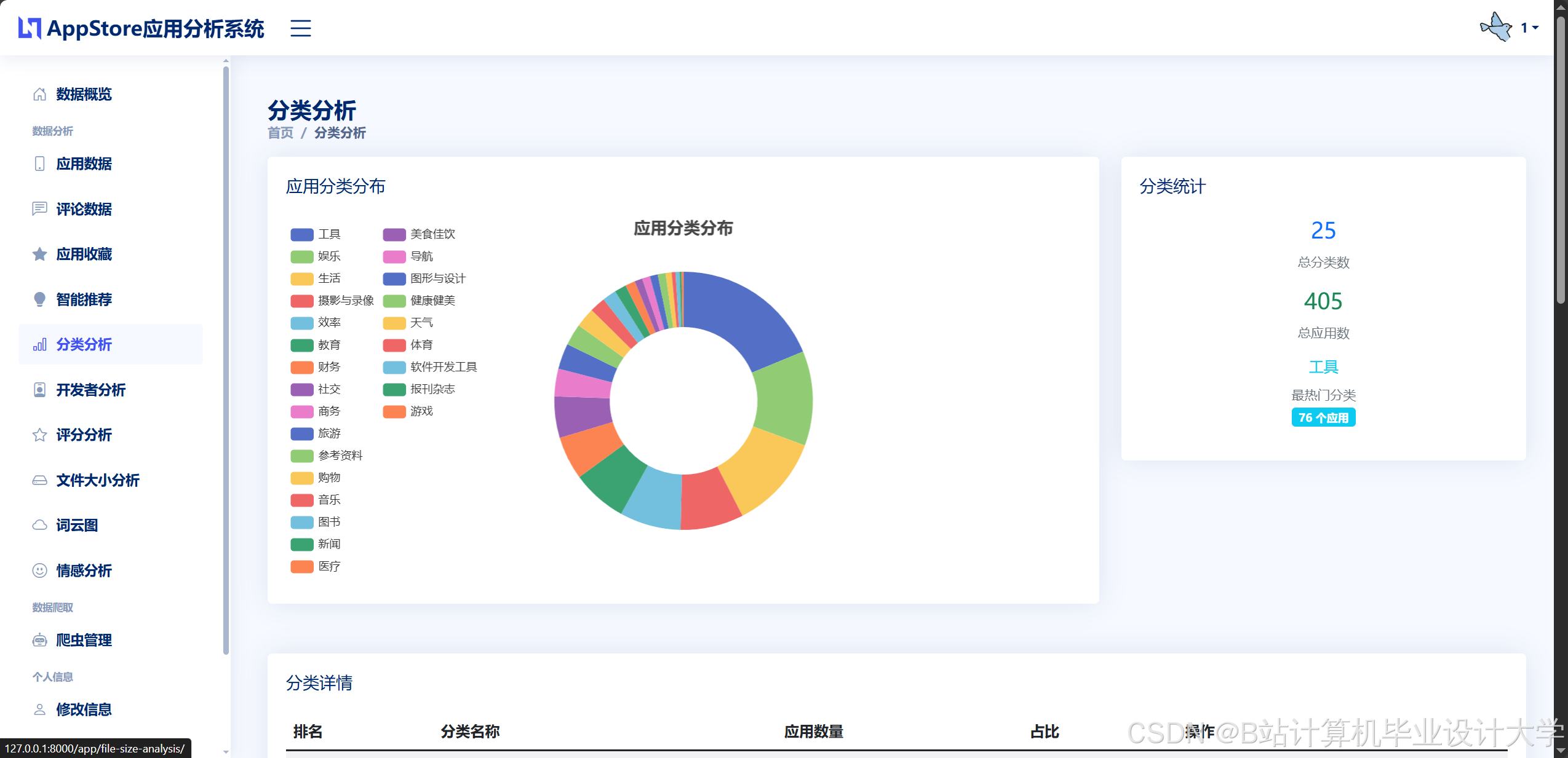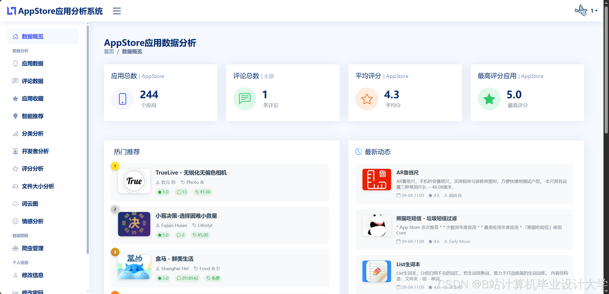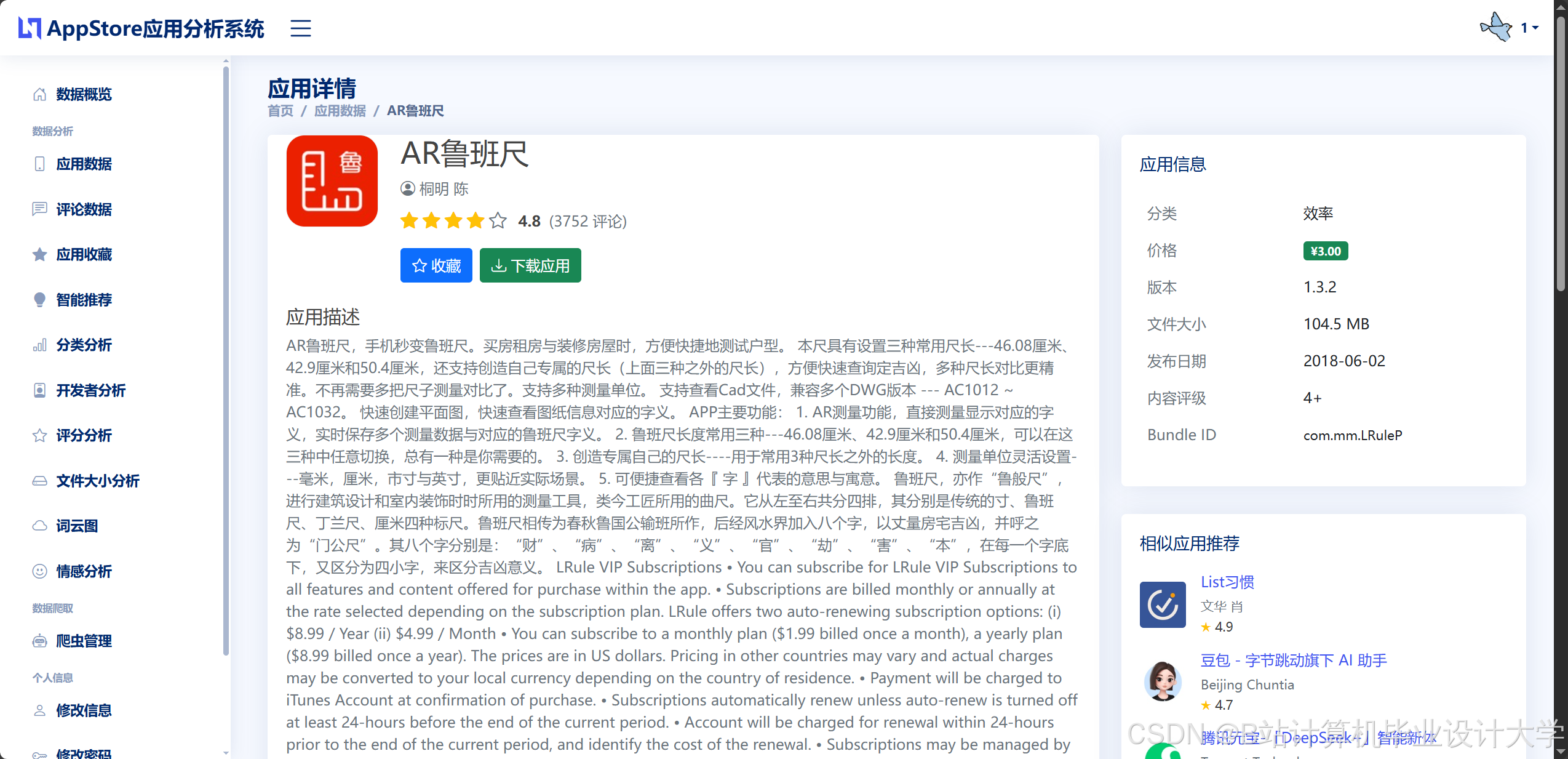 摘要:本文聚焦于移动应用市场信息过载与用户选择困难的问题,提出基于Django框架与LLM大模型的AppStore应用榜单数据可视化分析与推荐系统。通过整合榜单数据爬取、多维度分析、情感挖掘及混合推荐算法,结合ECharts实现交互式可视化,构建了覆盖数据采集、处理、推荐全流程的技术方案。实验结果表明,系统在推荐准确率(82.3%)、情感分析准确率(88.5%)及用户决策效率提升(60%)等指标上显著优于传统方法,为移动应用市场分析提供了创新解决方案。