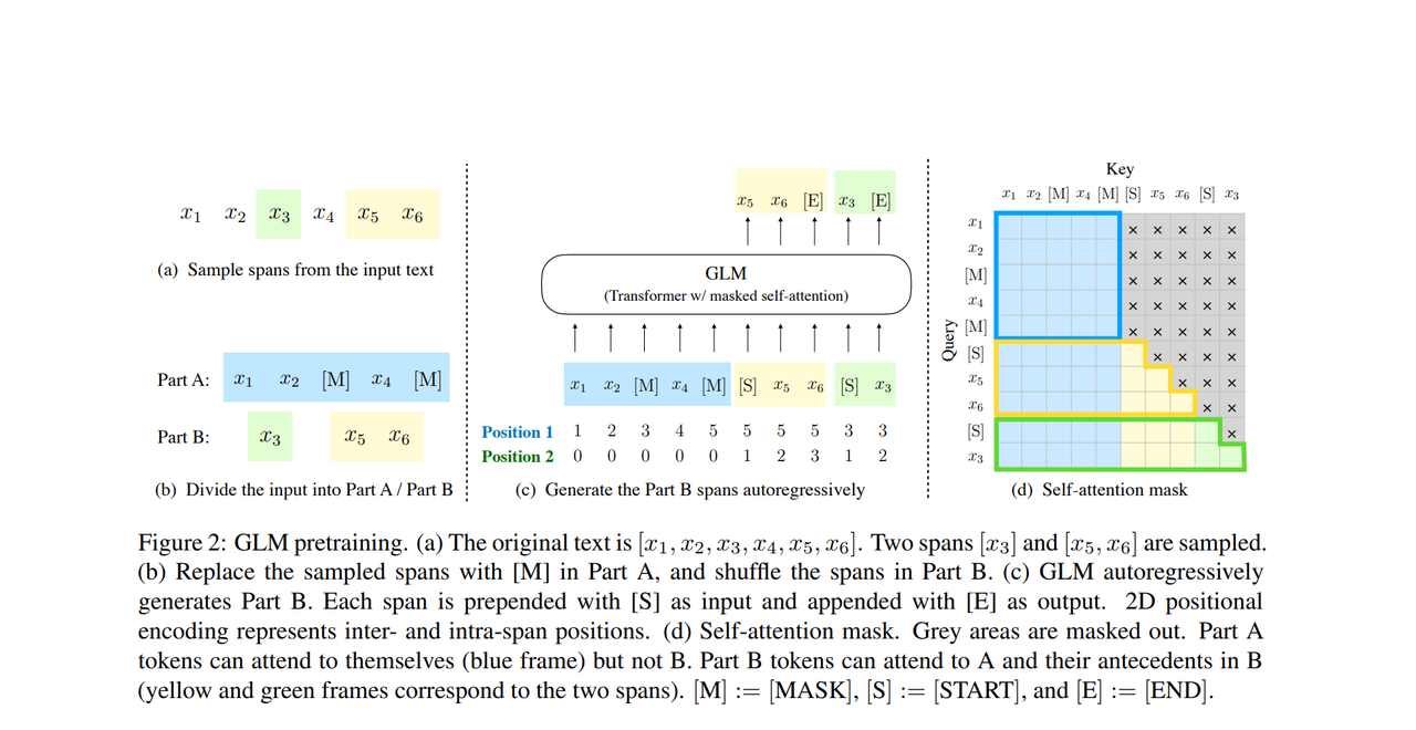 而这里我们从最右边的图d观察到,GLM把 INPUT SEQUENCE 里的所有的 TOKE,都作为了 DECODER 的 INPUTS 并且是将 INPUT 的 MASK 全部抹除,这样的话是为了方便让后面在预测的时候,可以参考更多 INPUT SEQUENCE 的信息。