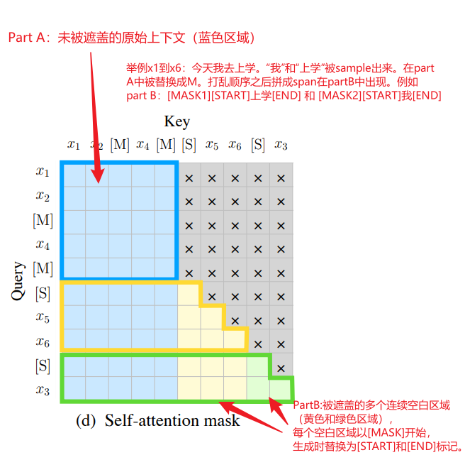不能关注任何Part B的token(灰色区域)。