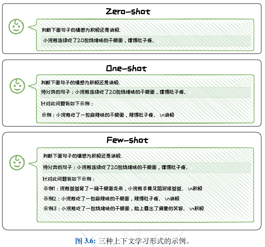 按照示例数量的不同,上下文学习可以呈现出多种形式:零样本(Zero-shot)上下文学习、单样本(One-shot)上下文学习和少样本(Few-shot)上下文学习。
