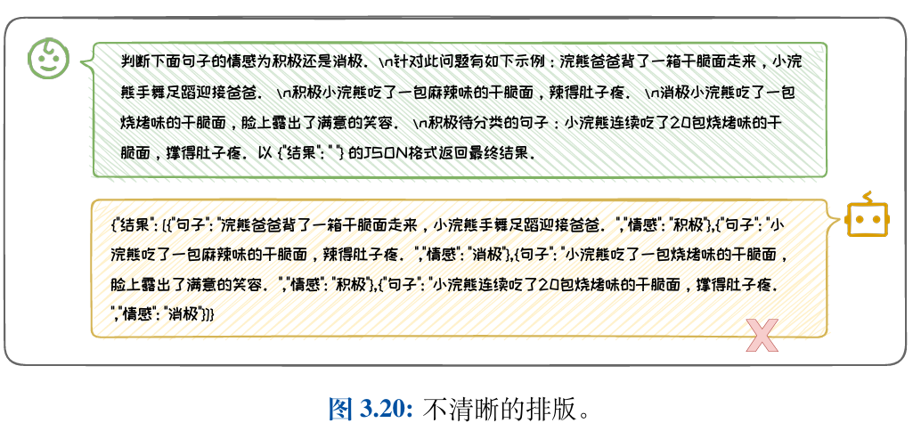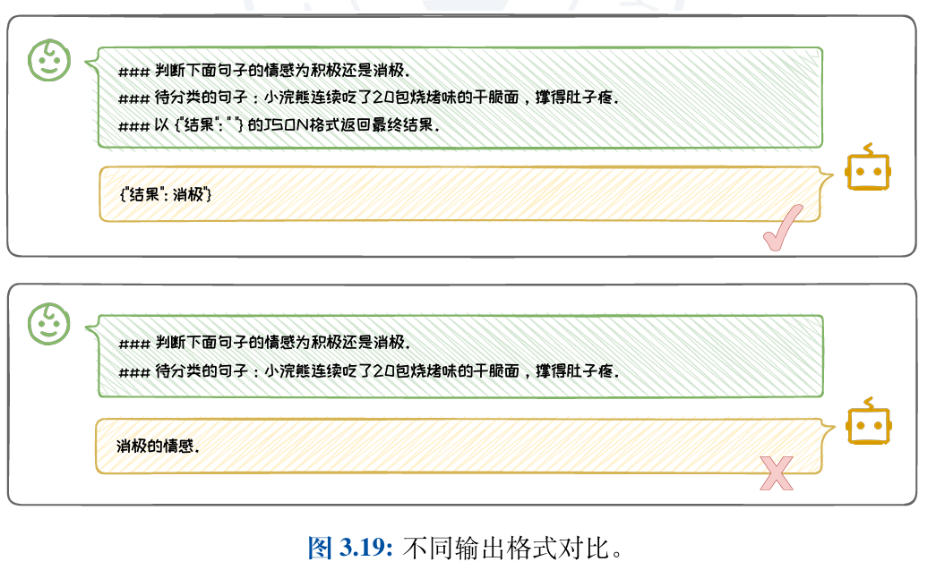 在图3.19中的Prompt例子中,“以{”结果”: “ ”}”的JSON格式返回最 终答案。”明确指定了答案应以JSON格式输出,并且以一个简短的例子指明JSON 中的关键字。这种规范的输出格式不仅使得结果易于解析和处理,还提高了模型 输出的准确性和一致性。如果不明确规定输出格式,模型可能会输出非结构化或 不规范的结果,这会增加后续处理的复杂性。在第二个例子中,如果模型输出的答 案是一个自由格式的文本字符串,那么提取具体信息就需要进行复杂的字符串解析,而不是像JSON等结构化格式那样可以直接提取,这就给后续对于结果的处理 与使用带来了麻烦。
