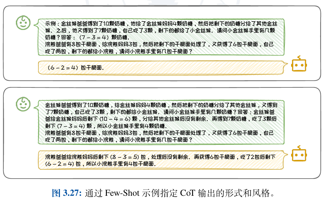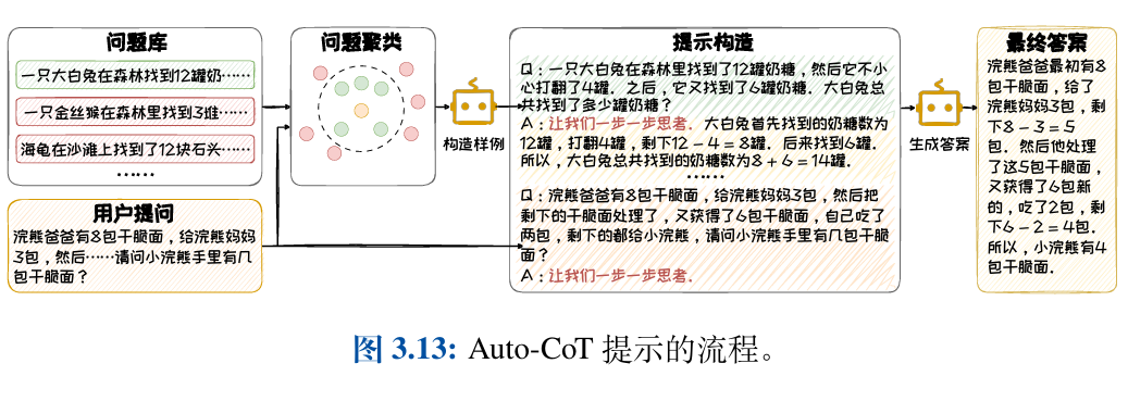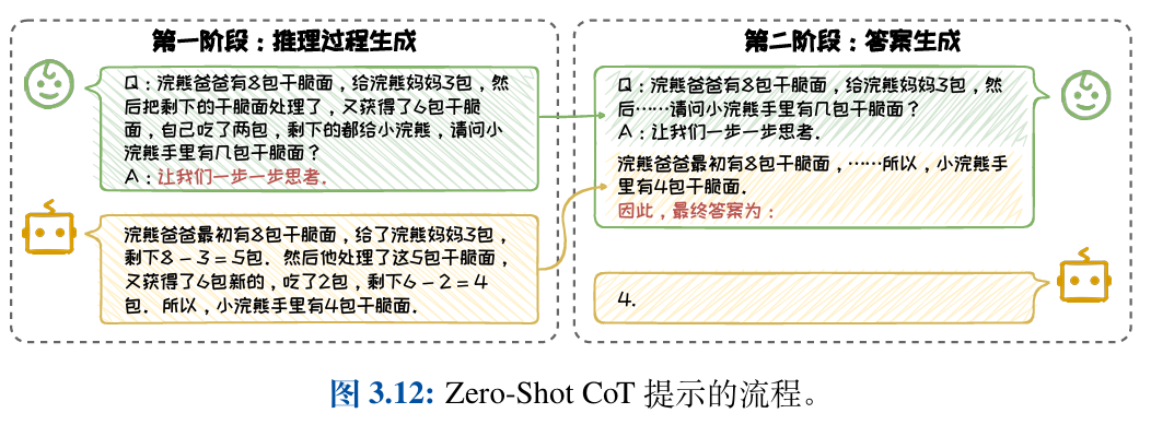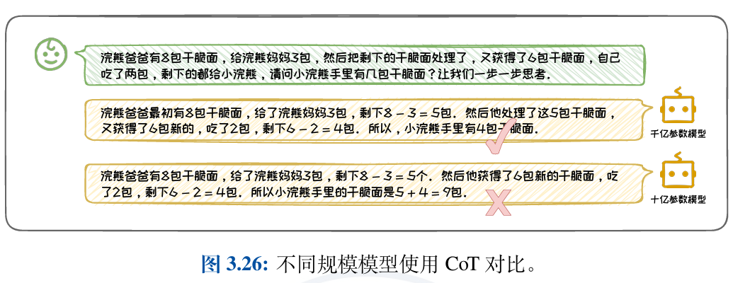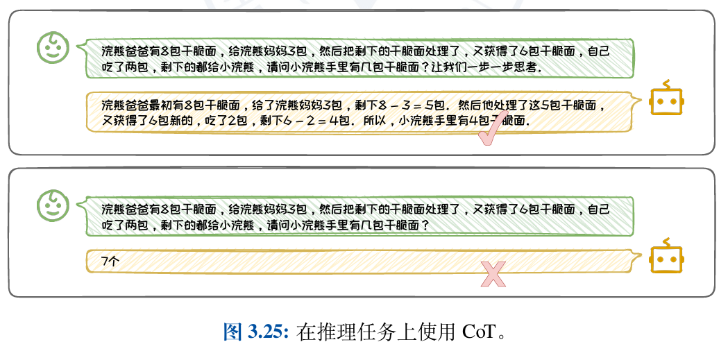 1.在任务类别方面,CoT技术特别适用于需要复杂推理的任务,如算术、常识和 符号推理。在这些任务上,CoT能够引导大语言模型生成逻辑严密、条理清晰的中 间推理步骤,从而提高正确答案的生成概率,如图3.25所示。然而,对于情感分类、常识问答等简单问题,反而可能引入不必要的复杂性。 常识问答等简单问题,标准的Prompt方法已足够有效,使用CoT可能难以提升效果,反而可能引入不必要的复杂性。