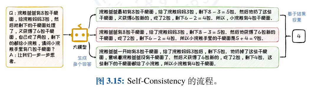 Self-Consistency 的实现过程可以分为三个步骤:(1)在随机采 样策略下,使用CoT或Zero-ShotCoT的方式来引导大语言模型针对待解决问题生 成一组多样化的推理路径; (2)针对大语言模型生成的每个推理内容,收集其最终的答案,并统计每个答案在所有推理路径中出现的频率; (3)选择出现频率最高的答案作为最终的、最一致的答案。