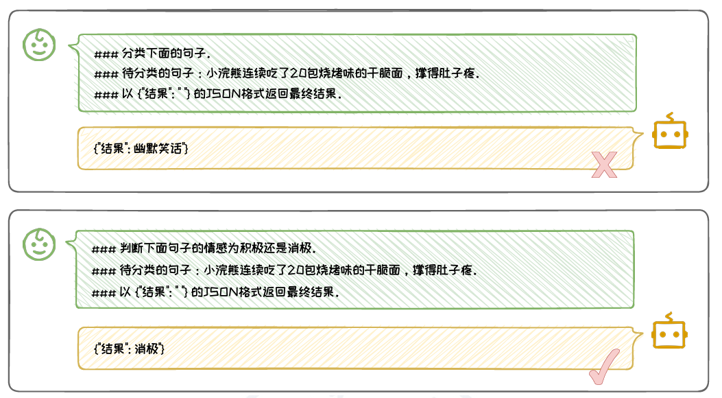 具体的名词:使用具体的名词来定义任务的输出或目标,例如“积极”和“消 极”在情感分类任务中提供了明确的分类标准。