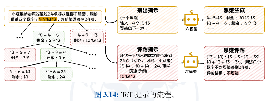 在这个例子中,给定4个数字,然后让大语言模型利用加减乘除(±*/)四个运算符来组合这四个数字,使 得最终的运算结果为24。首先,ToT基于当前所剩下的数字,通过上下文学习让模 型选择两个数字作运算,并生成多个方案,在图上表现为思维树的多个子节点。之后以广度优先搜搜的方式遍历每一个子节点,评估当前剩余的数字是否能够凑到 24 点,保留可能凑出24点的节点,这一步也是通过上下文学习的方式来实现的。 不断重复上述两个步骤,直到得出最终合理的结果。