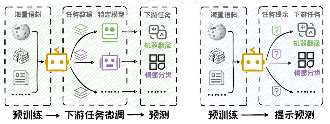传统的自然语言处理研究遵循“预训练-微调-预测”范式,即先在大规模语料 库上作预训练,然后在下游任务上微调,最后在微调后的模型上进行预测。然而, 随着语言模型在规模和能力上的显著提升,一种新的范式——“预训练-提示预测” 应运而生,即在预训练模型的基础上,通过精心设计Prompt引导大模型直接适应 下游任务,而无需进行繁琐微调。