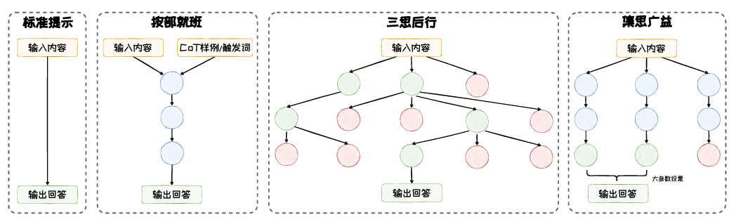 CoT方法的核心是构造合适的Prompt以触发大语言模型一步一步生成推理路 径,并生成最终答案。在CoT核心思想的指引下,衍生出了一系列的扩展的方法。这些扩展的方法按照其推理方式的不同,可以归纳为三种模式:按部就班、三思后行和集思广益。