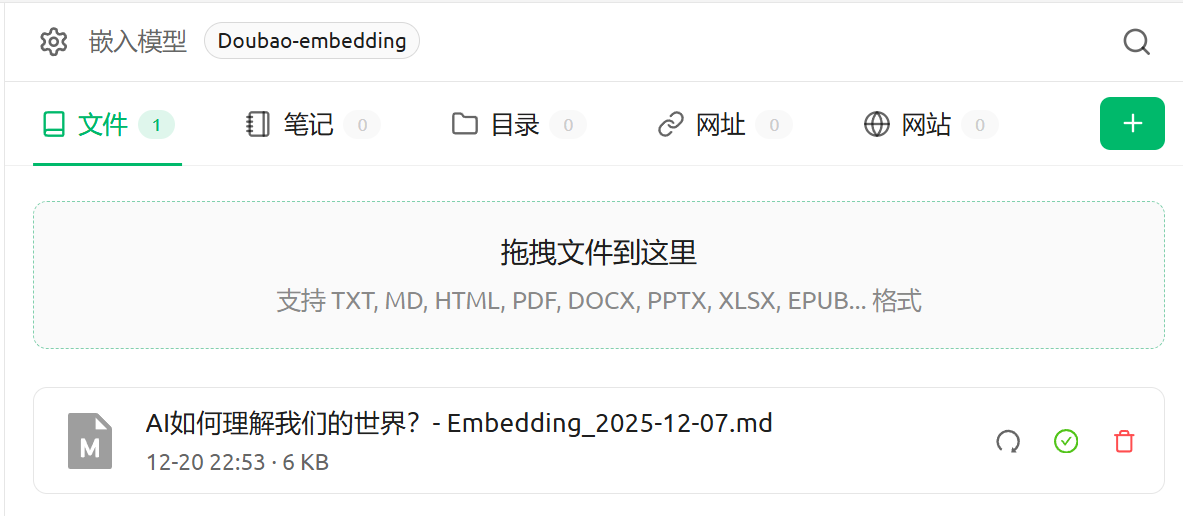 关键动作 —— 向量化: 当你添加文件后,系统会自动开始“向量化”处理。你会看到一个进度条,当显示绿色对勾 (✓) 时,代表处理完成。