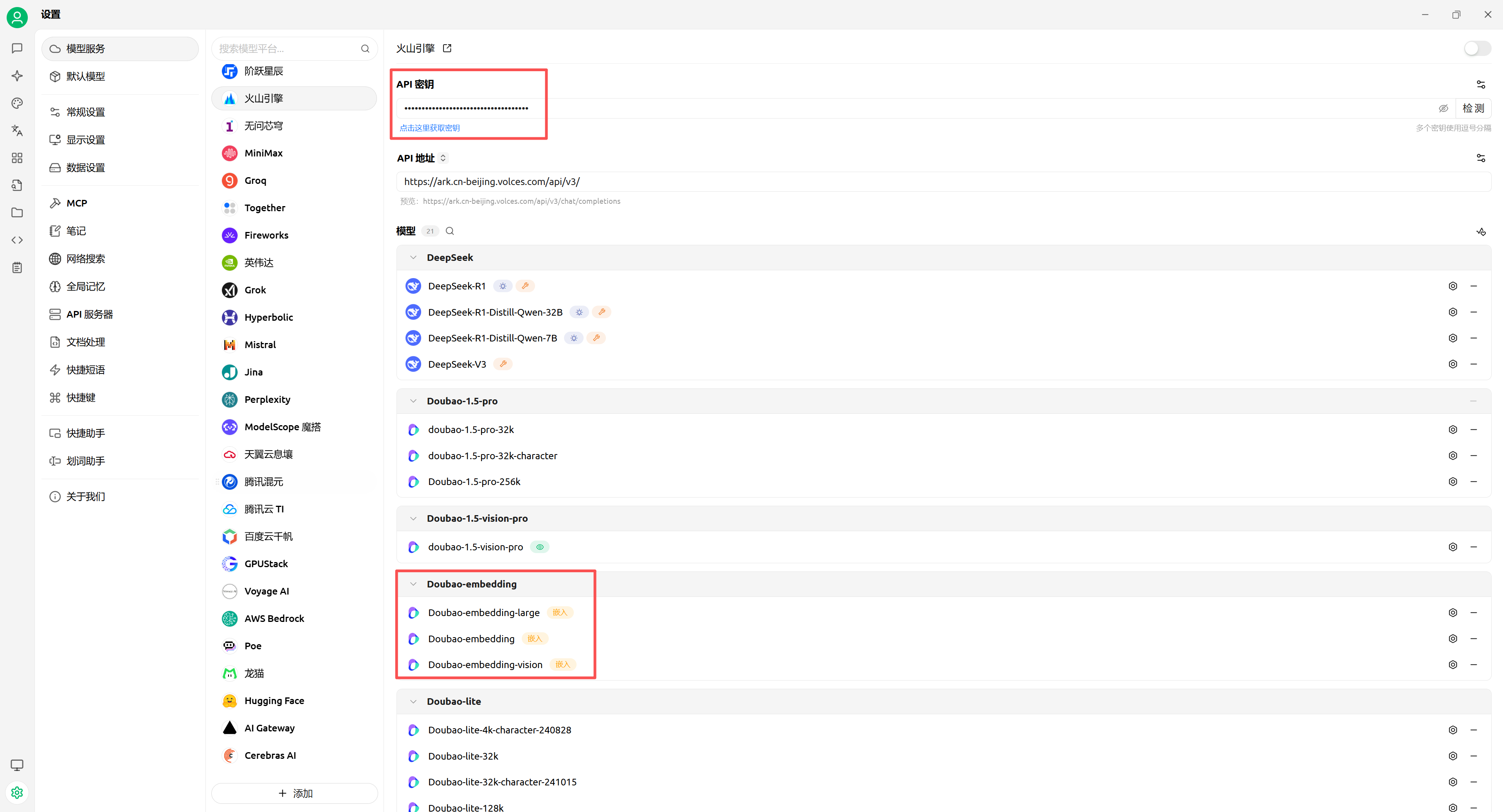 - 选择嵌入模型:选择Doubao-embeding模型,嵌入维度点击右侧刷新按钮自动设置即可。