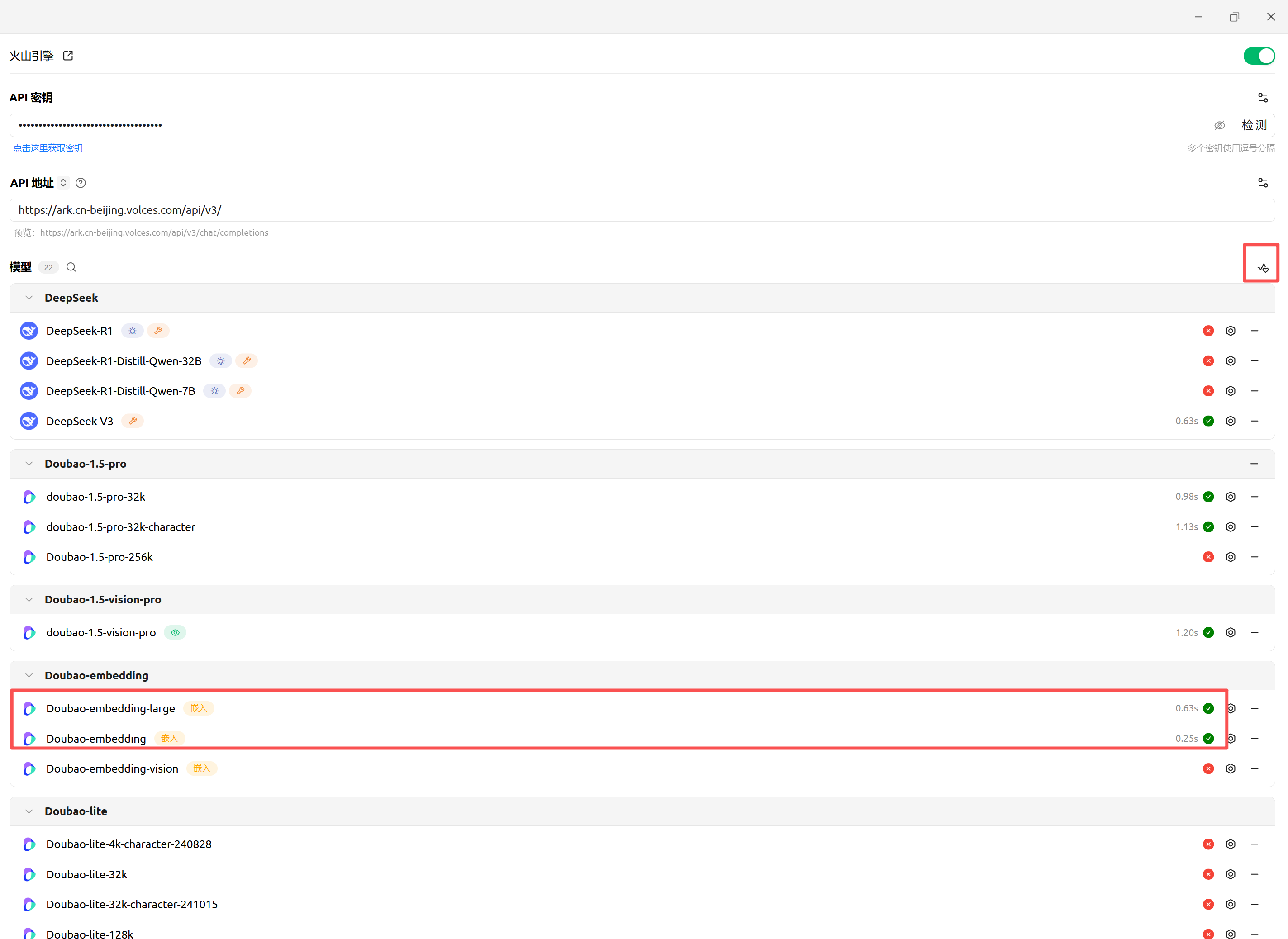 - 在Cherry-studio测试一下你的模型是否配置成功。如果不能访问可以前去火山引擎官网检查是否开启了这个模型服务。在模型右侧把不可用的模型删除,只展示可用模型。