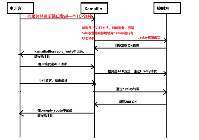 当使用有状态方式处理请求时(如使用t_relay()),响应会自动通过事务层找到对应uac,调用relay_reply执行转发。