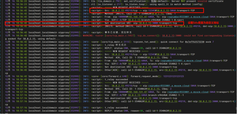 Request-URI 原本是 sip:12345@10.0.2.15:5060,但脚本中被 $du 覆盖为自定义地址。通过 $du = "sip:10.0.2.15:3000;transport=tcp" 强制指定转发目标,忽略原 Request-URI。
