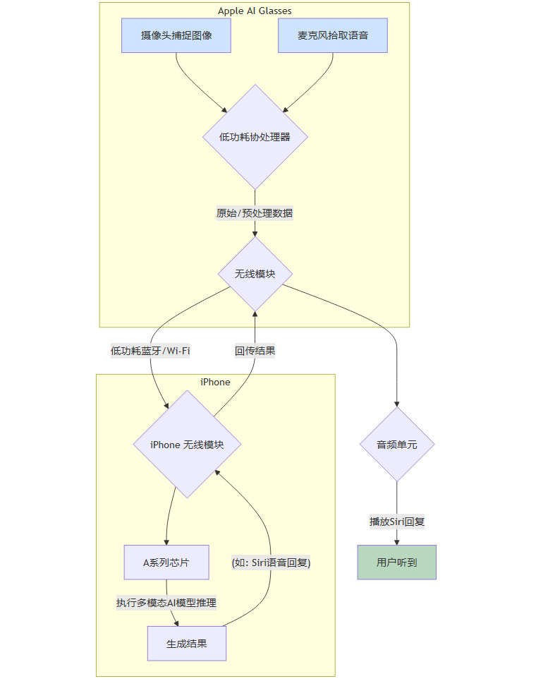 iPhone 端(重量级处理):眼镜通过低功耗蓝牙或 Wi-Fi 与用户的 iPhone 保持连接。绝大多数复杂的计算任务,特别是多模态 AI 模型的推理,都在 iPhone 上完成。iPhone 强大的 A 系列芯片将作为眼镜的“外置大脑”,处理完数据后再将结果(如 Siri 的语音回复)回传至眼镜。