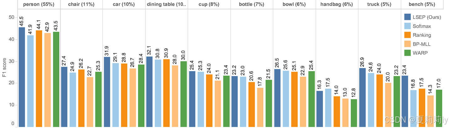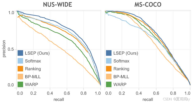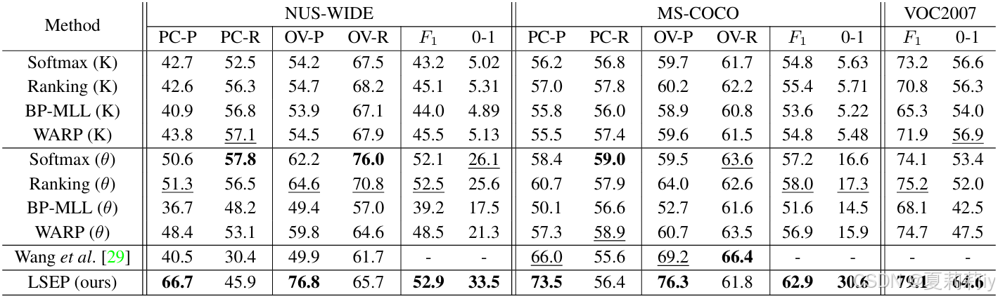 ①在标签预测方面,把LSEP和softmax, the standard pairwise ranking, WARP, 和BP-MLL对比