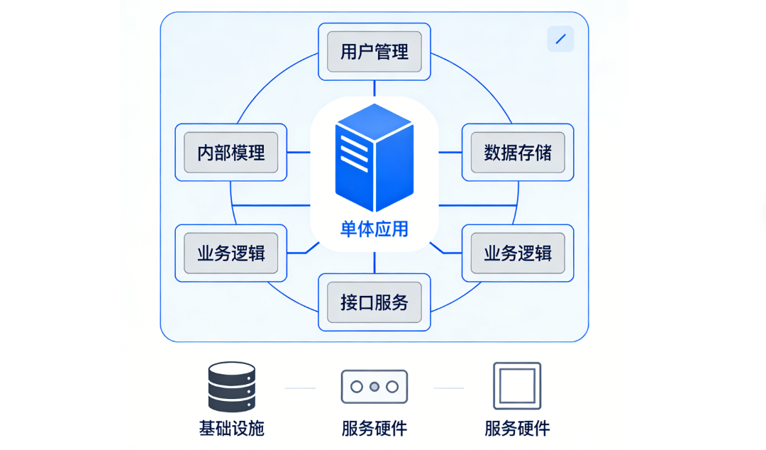 第一代:单体架构——像“一个大包袱”。早期的软件应用都是“单体结构”,所有功能都打包在一个程序里,比如早期的办公软件、小游戏。优点是简单直接,开发快;缺点也很明显:只要改一个小功能,整个系统都要重新测试、部署,而且无法应对大量用户同时使用(比如高峰期系统直接崩溃)。适合早期小体量业务,现在基本被淘汰。