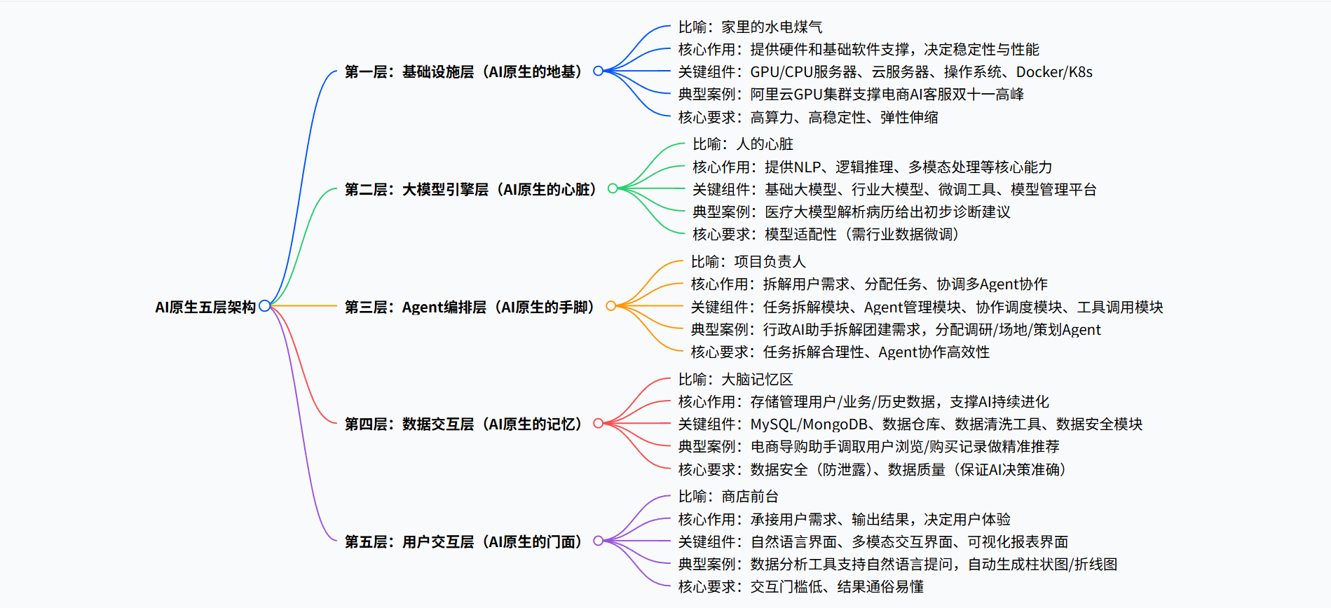 可能有朋友会问:“能不能简化一下,去掉某一层?”答案是:不能。这五层是“层层支撑、相互依赖”的,少了任何一层,AI原生应用都无法正常运行: