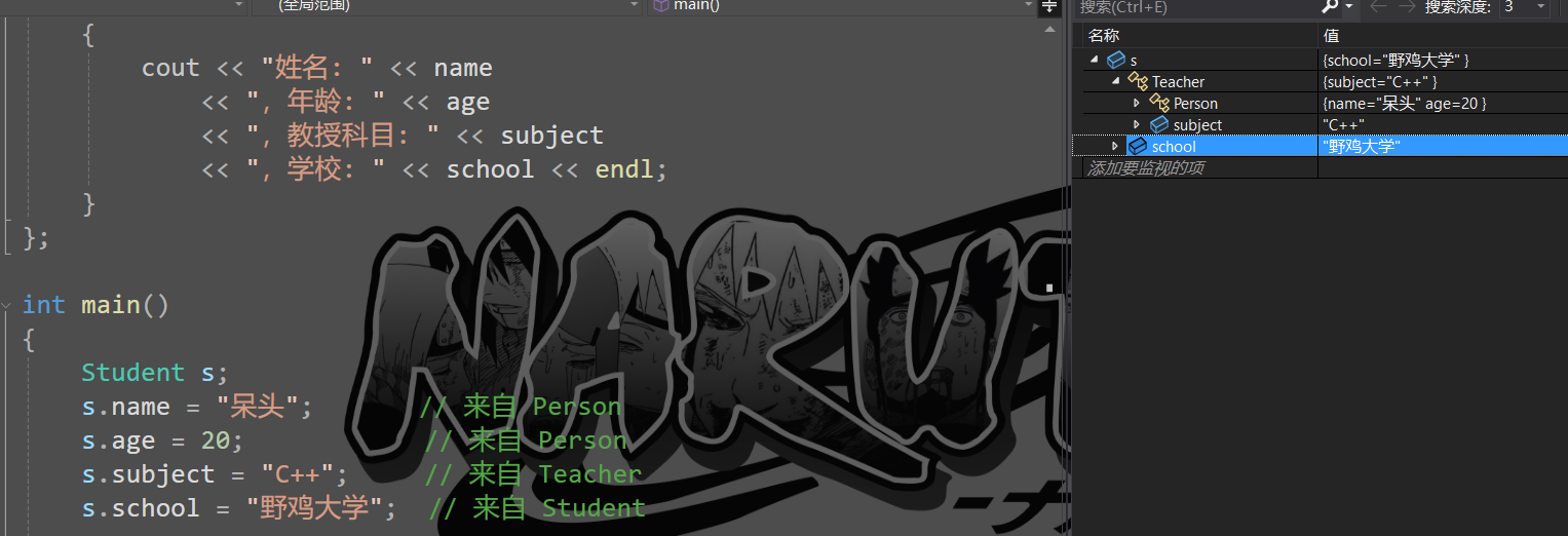 - 调用Student的Person的成员函数或者访问成员变量的时候,编译器就不知道选择Teacher中的还是Athlete中的那一份,就造成了二义性。