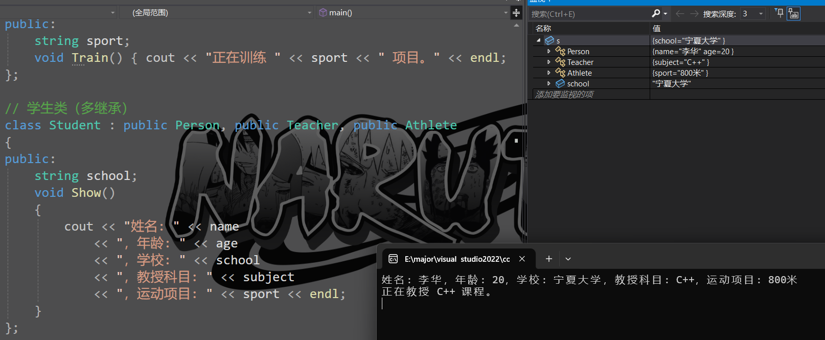 - 在 C++ 中,虚拟继承的使用方式是:当多个派生类继承自同一个公共基类,并且这些派生类又被同一个子类多继承时,应当在这些“中间层”父类继承公共基类的地方,使用 virtual 关键字进行修饰。(上述示例就应该在老师和运动处使用virtual进行修饰)