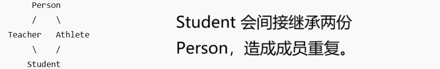 - 如果Student同时继承Teacher和Athlete,他就会有两份Person成员(一次从Teacher一次从Athlete),这样会造成数据冗余。