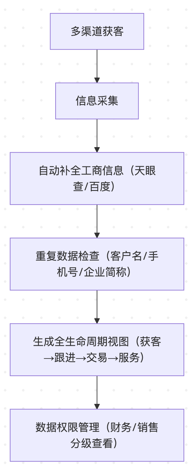 自动补全:通过天眼查、百度查公司接口自动填充工商信息(注册地址、法定代表人),通过手机号获取微信/支付宝头像昵称,解决“客户信息不全”的问题;