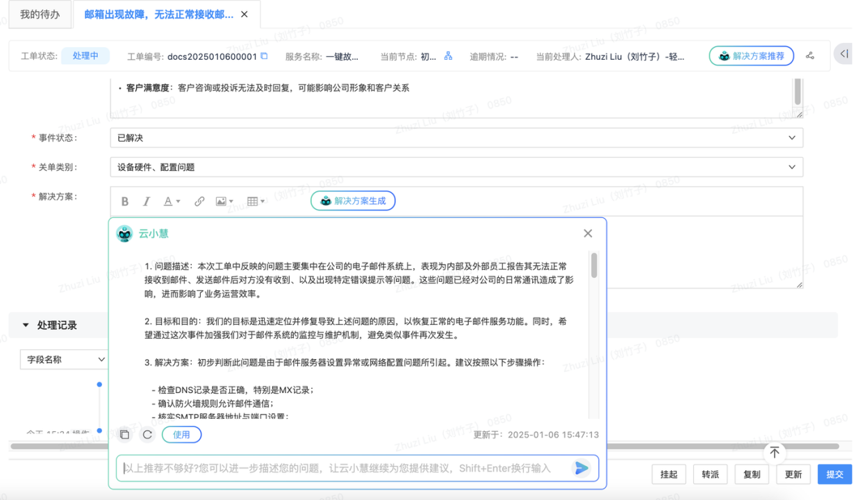 智能总结: AI自动提炼工单关键信息,生成摘要,让工程师快速把握问题全貌。