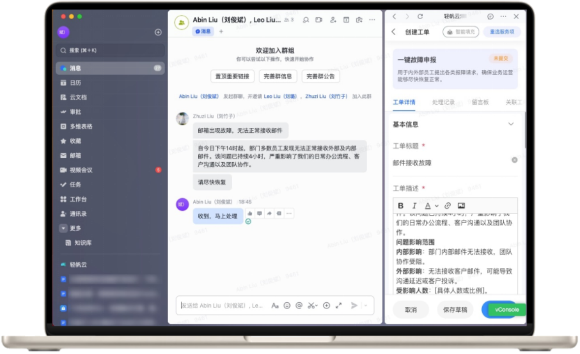 在第三方聊天群组(如飞书、钉钉)抓取关键词(如 “网络中断”),自动填充工单内容,提升建单效率。
