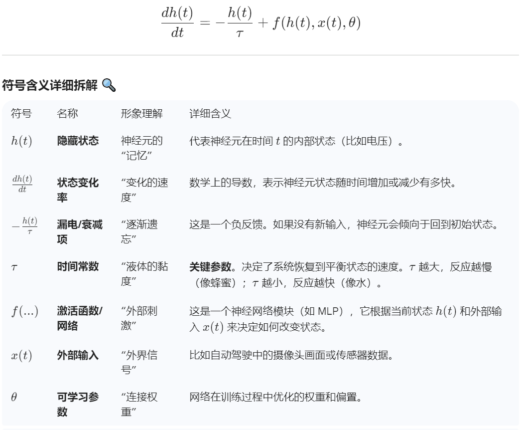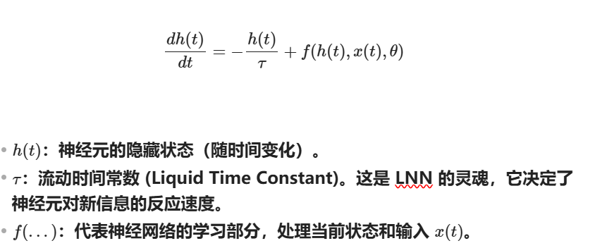 传统神经网络(如 RNN 或 Transformer)通常在离散的时间步上处理信息(例如每秒处理一帧)。而 LNN 将神经元的状态视为连续时间的演化。它使用常微分方程 (ODE) 来描述神经元随时间的变化: