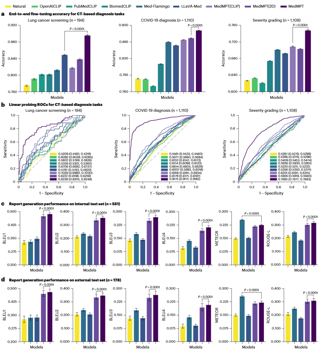 a,基于CT的诊断任务端到端微调的准确率:肺癌筛查(n=194)、COVID-19诊断(n=1,110)和COVID-19严重程度分级(n=1,108)。b,三个诊断任务的线性探测(Linear probing)ROC曲线。图中数值为ROC曲线下面积及95%置信区间(CIs)。虚线代表随机分类器的性能以供参考。c,内部测试集(n=551)上报告生成的定量指标。d,外部测试集(n=178)上的报告生成性能。数据显示为均值和95%置信区间(采用1,000次重采样的Bootstrap法)。P值使用MedMPT与最具竞争力的模型之间的双侧Wilcoxon秩和检验计算。
