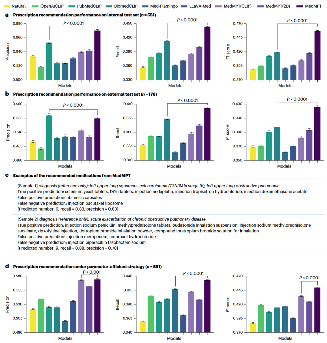 a,端到端微调下,MedMPT及对比模型在内部测试集(n=551)上的召回率、精确率和F1分数。b,外部测试集(n=178)上的性能比较。c,MedMPT推荐药物与回顾性处方标签对比的两个示例。患者诊断仅用于说明目的,模型未获取该信息。Diyu tablet(地榆升白片),一种用于增加白细胞计数的中药。d,使用参数高效策略(parameter-efficient strategy)在内部测试集上的性能,该策略中预训练权重被冻结,仅微调特定任务模块。数据显示为均值和95%置信区间(采用1,000次重采样的Bootstrap法)。P值使用MedMPT与最具竞争力的模型之间的双侧Wilcoxon秩和检验计算。
