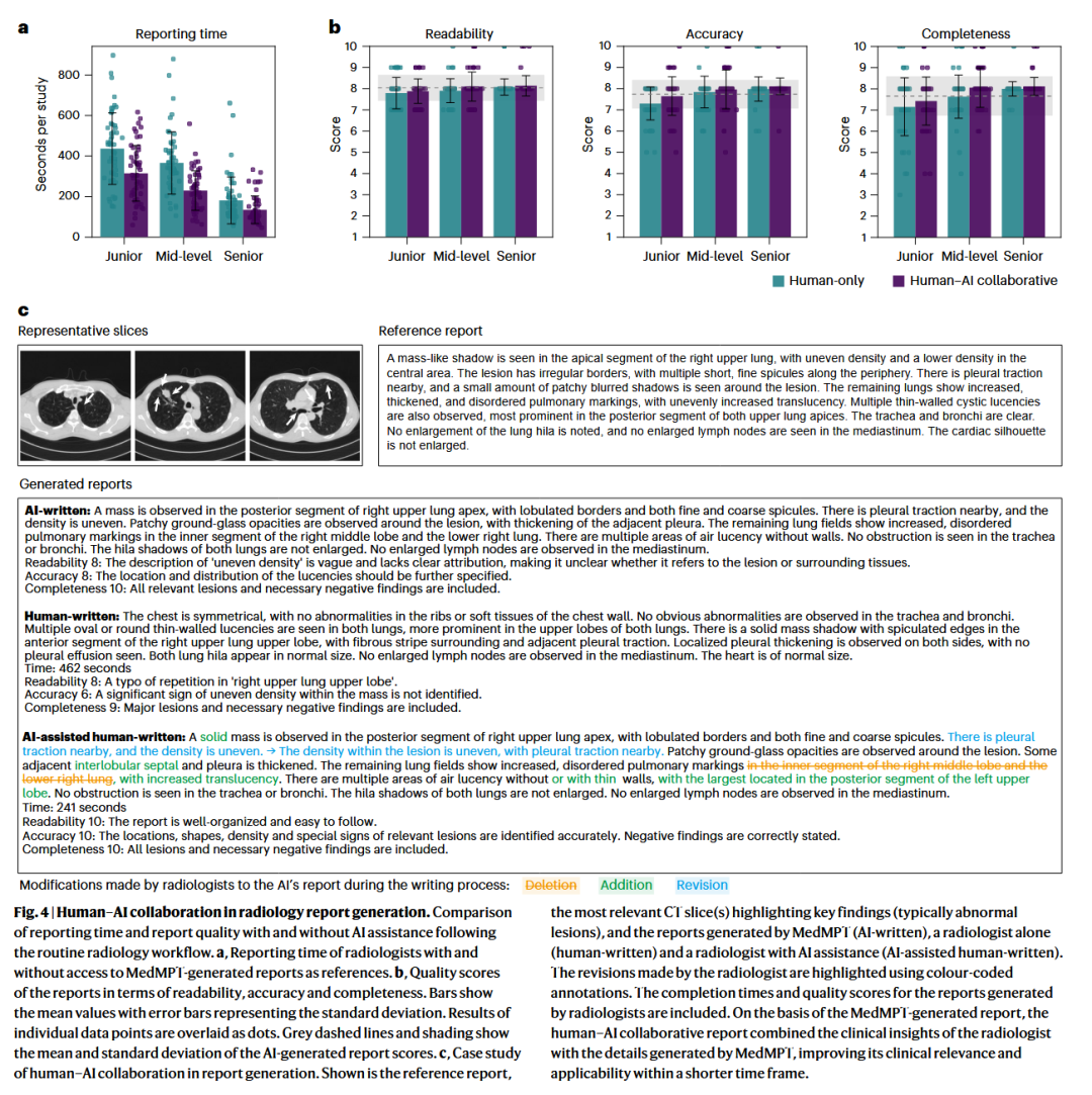 遵循常规放射工作流,比较有无AI辅助时的报告时间和报告质量。a,放射科医生在有无参考MedMPT生成报告情况下的报告时间。b,报告在可读性、准确性和完整性方面的质量评分。柱状图显示均值,误差条代表标准差。单个数据点的结果以散点形式叠加。灰色虚线和阴影显示AI生成报告评分的均值和标准差。c,报告生成中人机协作的案例研究。图中展示了参考报告、突出关键发现(通常是异常病灶)的最相关CT切片,以及由MedMPT生成的报告(AI撰写)、放射科医生独立撰写的报告(人工撰写)和有AI辅助的放射科医生撰写的报告(AI辅助人工撰写)。放射科医生所做的修改使用颜色编码注释突出显示。包含了放射科医生生成报告的完成时间和质量评分。在MedMPT生成报告的基础上,人机协作报告结合了放射科医生的临床见解与MedMPT生成的细节,在更短的时间内提高了其临床相关性和适用性。