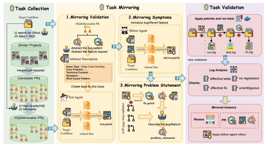 核心方法:三阶段流水线打破任务与环境的强绑定。1) 采集阶段:从功能相似的高星仓库过滤可镜像PR;2) 镜像阶段:通过GPT-4系列模型三步转换——生成新测试用例(test.patch)、在目标仓库复现缺陷(mirror.patch)、合成自然语言描述;3) 验证阶段:执行严格的状态转移检查,确保测试有效、修复有效、无回退。