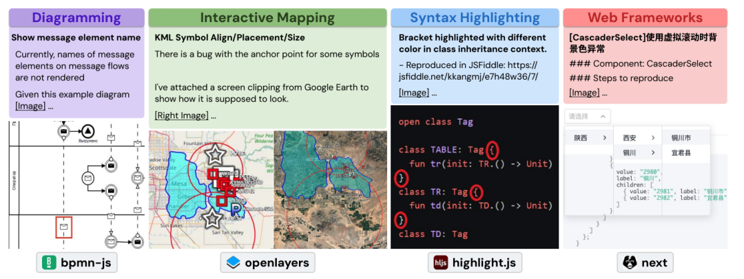 SWE-bench M包含617个真实GitHub任务实例,源自17个JavaScript库,涵盖Web界面设计、数据可视化、交互式地图等场景。每个实例均在问题描述或测试中包含图像/视频,其中83.5%的任务必须依赖视觉信息才能解决。数据集引入视觉测试、多语言混合编程(JavaScript/TypeScript/HTML/CSS)等新挑战。
